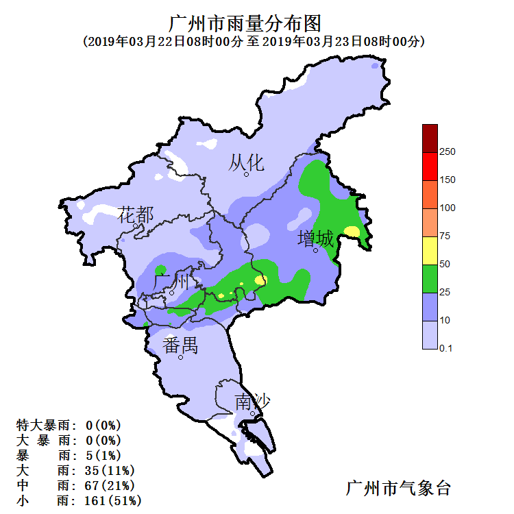 受切變線和冷空氣共同影響,2019年3月22日白天至夜間我市出現了一次中到大雨,局部暴雨的天氣過程,局部伴有短時強降水和雷電。據統計,22日08時至23日08時,全市平均雨量10mm,5個測站錄得50mm(暴雨)以上的雨量,35個測站錄得25mm(大雨)以上的雨量,其中增城區正果鎮錄得全市最大雨量61.3mm,增城區仙村站錄得最大小時雨強39.1mm;海珠區琶洲公園錄得中心城區最大雨量36.1mm,橋頭公園錄得小時最大雨量24.4。