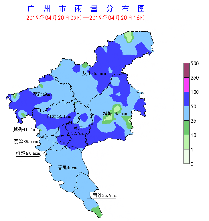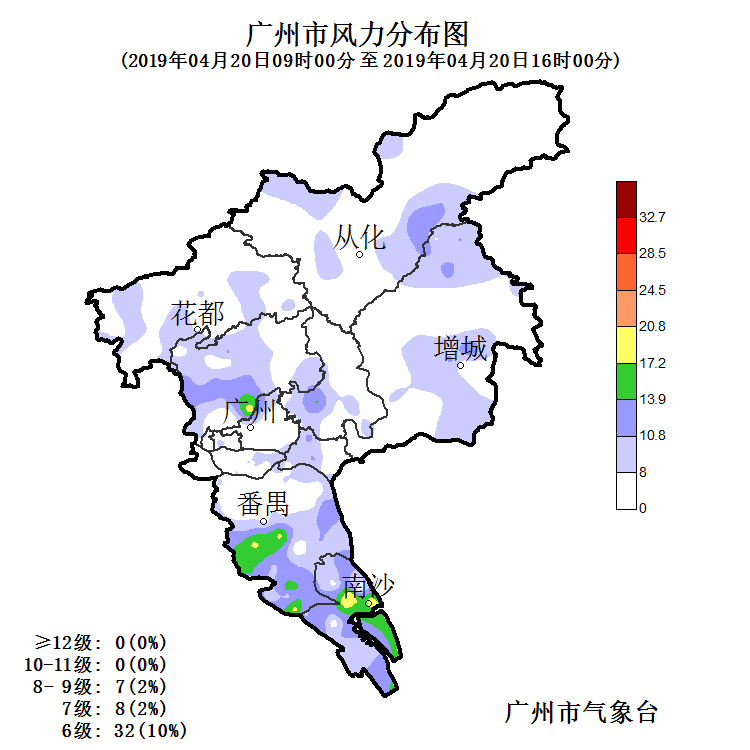 4月20日9時(shí)至16時(shí),廣州各區(qū)出現(xiàn)了暴雨,并伴有強(qiáng)降水、強(qiáng)雷電和局部短時(shí)大風(fēng)等強(qiáng)對(duì)流天氣,根據(jù)氣象水文站網(wǎng)的監(jiān)測(cè),4月20日9時(shí)至16時(shí),全市共有148個(gè)測(cè)站雨量超過50毫米,全市最大降水量出現(xiàn)在白云區(qū)銅鑼灣水庫,為80.5毫米;天河區(qū)車陂錄得市區(qū)最大降水62.3毫米。全市平均面雨量45.7毫米,面雨量前三的區(qū)分別為天河(54.4毫米)、黃埔(53.9毫米)、花都(49毫米)。另外,全市共有42個(gè)測(cè)站錄得6級(jí)及以上陣風(fēng),其中南沙區(qū)南沙街站錄得最大陣風(fēng)20.4米/秒(8級(jí)),海珠區(qū)琶洲街錄得市區(qū)最大陣風(fēng)11米/秒(6級(jí))。