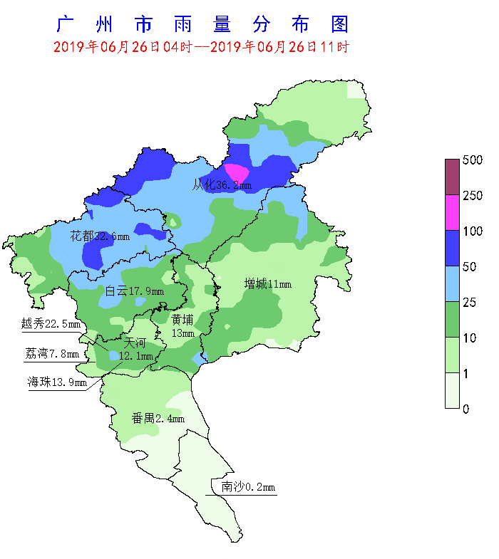 26日凌晨至上午,廣州市從化、花都區(qū)出現(xiàn)了暴雨局部大暴雨,白云、黃埔、增城、市區(qū)出現(xiàn)中到大雨,番禺、南沙出現(xiàn)小雨,并伴有強(qiáng)雷電。據(jù)氣象水文監(jiān)測,26日04時(shí)至11時(shí),全市平均面雨量為17.9毫米,共有30個(gè)站點(diǎn)錄得50毫米以上降水,2個(gè)站點(diǎn)雨量在100毫米以上。從化區(qū)荔泉路錄得最大降水量129毫米和最大小時(shí)雨量65.1毫米。越秀區(qū)永安橫街錄得市區(qū)最大累積雨量33.5毫米,越秀區(qū)北京街錄得市區(qū)最大小時(shí)雨量31.6毫米。各區(qū)最大累積雨量(單位:毫米):從化129,花都82.4,增城49,黃埔39.4,白云34.9,越秀33.5,海珠31.1,天河25.6,荔灣13.1,番禺12.9,南沙1.5。此次過程以強(qiáng)降水為主,最大陣風(fēng)僅5級,出現(xiàn)在增城石灘鎮(zhèn)。