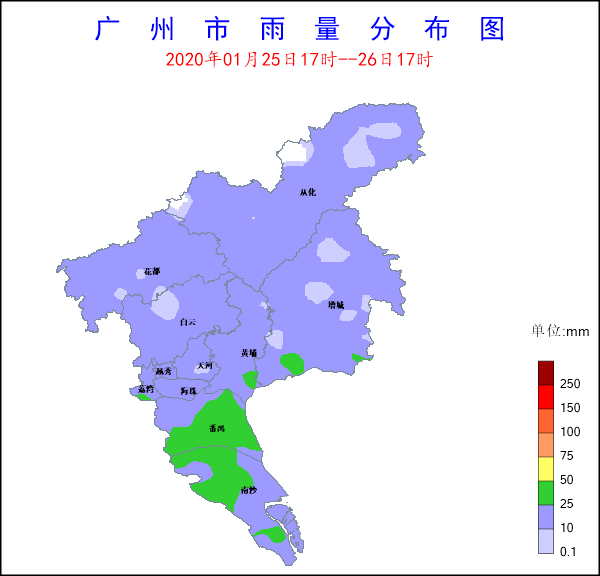 1月25日傍晚至26日下午,受冷空氣和切變線影響,廣州市普遍出現中雨局部大雨,部分地區伴有6-7級陣風和雷電。據氣象水文監測,25日17時至26日17時,全市平均面雨量為18.3毫米,共有13個測站錄得30~50毫米降水,其中,增城石灘鎮土江村錄得全市最大累積雨量37.5毫米;全市共有66個站點出現大風,南沙區龍穴街海港大道錄得最大陣風17.3m/s(8級)。