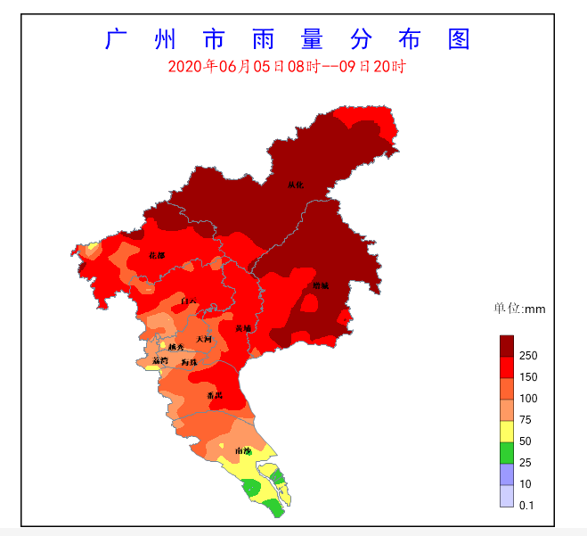 累積雨量大:5日08時(shí)至9日20時(shí),增城、從化和花都分別錄得各區(qū)過(guò)程最大累積降水量689.3毫米(增城正果)、477.1毫米(從化鰲頭)和461.3毫米(花都梯面)。其中增城正果過(guò)程最大累積降水量為2005年以來(lái)第一大值(第二大值為2013年8月13-17日從化呂田的688.4毫米)。全市364個(gè)站出現(xiàn)降水(占比100%),其中350個(gè)站(占比96.1%)出現(xiàn)50毫米以上累積降水,274個(gè)站(占比75.2%)出現(xiàn)100毫米以上累積降水,74個(gè)站(占比20.3%)出現(xiàn)250毫米以上累積降水。全市平均累積面雨量為177.2毫米,各區(qū)過(guò)程累積面雨量:從化區(qū)337.7毫米、增城區(qū)322.3毫米、花都區(qū)199.2毫米、黃埔區(qū)166.8毫米、番禺區(qū)139.0毫米、白云區(qū)145.8毫米、南沙區(qū)82.0毫米、海珠區(qū)83.3毫米、荔灣區(qū)83.9毫米、天河區(qū)81.5毫米、越秀區(qū)69.4毫米。