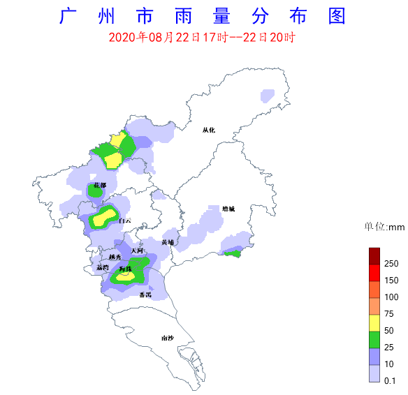 2020年8月22日17時至20時,廣州的偏西部地區出現了中到大雨局部暴雨,并伴有6-8級瞬時大風。共有23個站點錄得25-50毫米降水,12個站點錄得50-100毫米降水,全市平均面雨量為5.7毫米。最大降雨量為83.8毫米,最大小時雨量為81.3毫米,均出現在番禺區洛浦街。全市53個站點出現了6-7級大風,3個站點出現8-9級大風,其中白云區均禾街錄得最大陣風19.2米/秒(8級)。