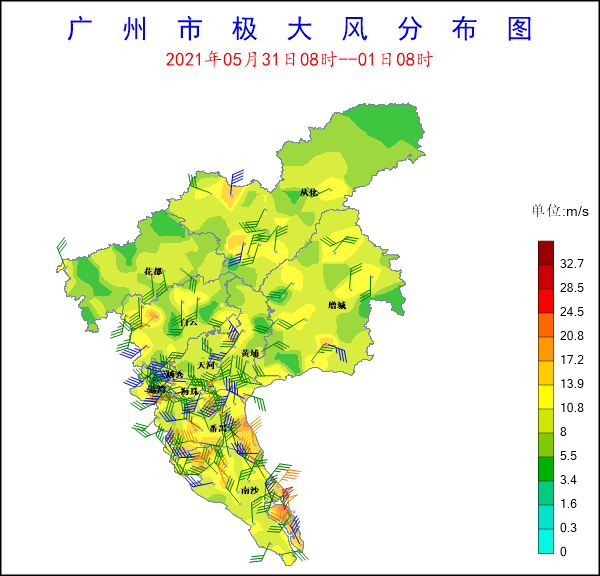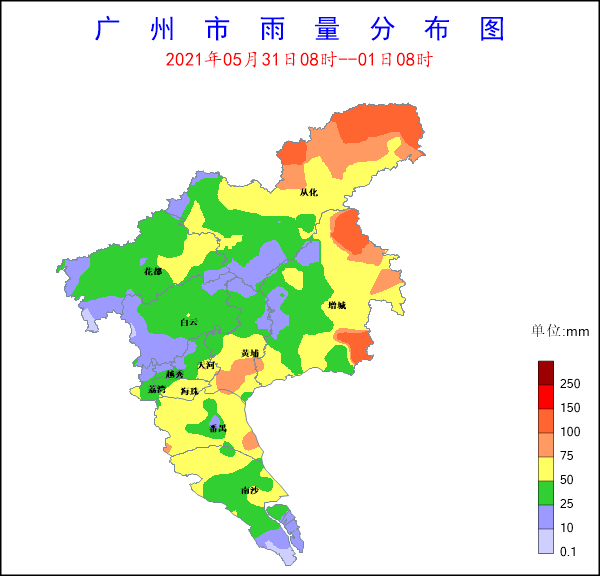 受西南氣流影響,2021年5月31日8時至1日8時,全市共有363個測站(100%)出現降雨,全市平均雨量48.4毫米,12個測站(3.31%)雨量超過100毫米,154個測站(42.42%)雨量超過50毫米,125個測站(34.44%)雨量超過25毫米。雨量較大的站點有:從化呂田東明國家氣象觀測站140.4mm,增城區派潭鎮七境小學135.7mm,增城區石灘鎮三江建設路133.9mm,從化呂田東聯氣象觀測站130.8mm,從化良口仙溪氣象觀測站122.4mm。全市共有:1個測站(0.28%)錄得10級以上陣風,17個測站(4.68%)錄得8級以上陣風,14個測站(3.86%)錄得6級以上陣風。風力較大的站點有:南沙區龍穴街龍穴村四涌舊堤24.5m/s,南沙區龍穴街舢舨洲23.9m/s,番禺區石樓鎮工業路22.2m/s,白云區人和鎮西湖村21.4m/s,番禺區新造鎮崇德村20.1m/s。