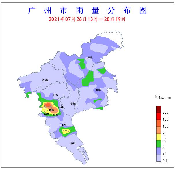 降水集中:強降水主要降水時段為傍晚前后,落區為我市中部地區。13至19時,全市9個測站(2.49%)雨量在100~250毫米之間,29個測站(8.01%)雨量在50~100毫米之間,29個測站(8.01%)雨量在25~50毫米之間。平均雨量較大的區有:越秀區71.4毫米,天河區57.7毫米,海珠區54.9毫米,荔灣區42.5毫米,白云區21.4毫米。