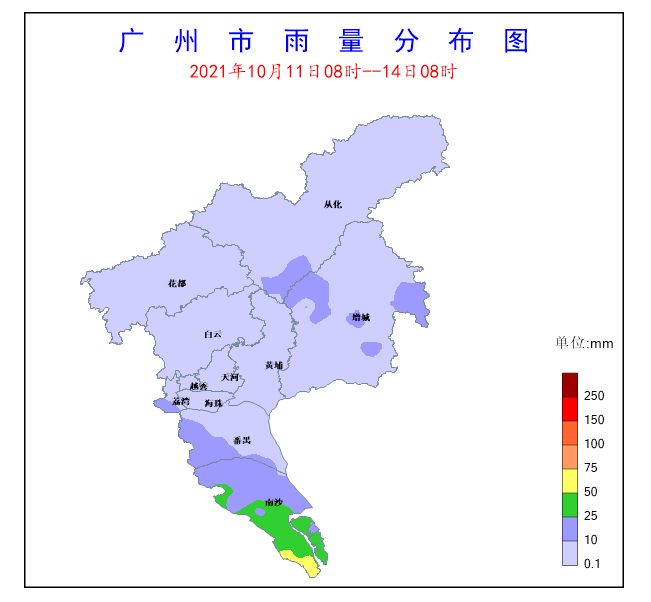 降水小:全市除南沙區有中到大雨局部暴雨外,其余各區以小雨降水為主,南沙區萬頃沙鎮錄得全市最大過程累積降水58.4毫米。降水主要集中在12日夜間至13日夜間,全市平均雨量8.9毫米(小雨量級)。