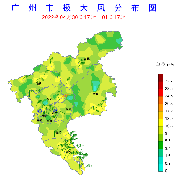 4月30日17時至5月1日17時,受冷空氣、切變線、熱帶系統共同影響,我市大部地區出現暴雨,花都部分地區出現大暴雨。全市共有365個測站(95.3%)出現降雨,4個測站(1%)雨量在100~250毫米之間,196個測站(51.2%)雨量在50~100毫米之間,49個測站(12.8%)雨量在25~50毫米之間,花都區獅嶺鎮錄得全市最大累積雨量126.5毫米。全市平均雨量59.1毫米,各區平均雨量:越秀區51.8毫米,天河區66.4毫米,荔灣區56.5毫米,海珠區56毫米,白云區64.8毫米,黃埔區61.2毫米,番禺區56.3毫米,南沙區50.3毫米,花都區81.5毫米,增城區53.8毫米,從化區52.5毫米。本次過程有14個測站錄得小時雨強超過20毫米的短時強降水,最大小時雨量31.9毫米,出現在花都區赤坭鎮。另外,過程中我市有60個測站出現6-8級大風,白云區太和鎮帽峰山錄得全市最大瞬時大風17.5米/秒(8級)。