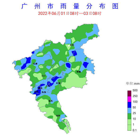 6月1日08時至3日08時,受西南氣流影響,我市普遍出現(xiàn)大到暴雨降水過程。全市共有380個測站(94.1%)出現(xiàn)降雨,全市平均雨量25.6毫米,1個測站(0.2%)雨量在100~250毫米之間,48個測站(11.9%)雨量在50~100毫米之間,111個測站(27.5%)雨量在25~50毫米之間。各區(qū)平均雨量(單位:毫米):海珠區(qū)61.9,天河區(qū)61.3,越秀區(qū)57.7,荔灣區(qū)32.9,黃埔區(qū)30.7,花都區(qū)26.2,從化區(qū)22.5,白云區(qū)19.4,增城區(qū)18.8,番禺區(qū)18,南沙區(qū)13.2。