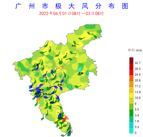 其中海珠區(qū)鳳陽街錄得最大累積雨量102.9毫米,海珠區(qū)南石頭街得最大小時雨強49.5毫米。過程伴有強雷電和短時大風,全市共95個測站錄得6~8級陣風,南沙區(qū)南沙街錄得全市最大陣風31.8米/秒。