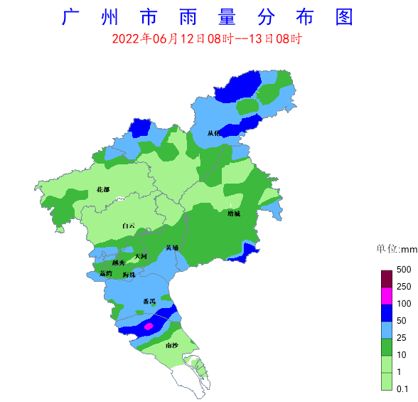 6月12日08時至13日08時,受低渦切變和西南氣流共同影響,我市普遍出現大到暴雨局部大暴雨降水過程。全市共有373個測站(92.3%)出現降雨,全市平均雨量20.5毫米,3個測站(0.7%)雨量在100~250毫米之間,20個測站(5%)雨量在50~100毫米之間,105個測站(26%)雨量在25~50毫米之間。各區平均雨量(單位:毫米):番禺區35.8,荔灣區32,越秀區26,從化區24.3,海珠區23.6,黃埔區22.5,天河區21.8,南沙區20.6,增城區17.1,白云區10.2,花都區7.8。其中南沙區欖核鎮錄得最大累積雨量114.6毫米,南沙區東涌鎮得最大小時雨強95.7毫米。過程伴有強雷電和短時大風,全市共20個測站(5%)錄得8~10級陣風,109個測站(27%)錄得6~8級陣風,天河區前進街錄得全市最大陣風23.5米/秒。