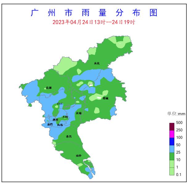 4月24日13時至19時,我市出現了中到大雨、局部暴雨,并伴有6-8級大風和雷電。全市共有428個站點(93.2%)出現降雨,平均雨量23.6毫米,其中1個站點(0.2%)雨量在50~100毫米之間,173個站點(37.7%)雨量在25~50毫米之間。各區平均雨量(單位:毫米):海珠區38.5,越秀區36.5,天河區34.1,荔灣區32.9,白云區29.1,黃埔區24.7,花都區23.5,番禺區23.2,增城區19.5,從化區18.6,南沙區16.7,其中海珠區官洲街錄得全市最大累積雨量52.3毫米。全市共有48個站點(10.5%)錄得6級以上陣風,其中2個站點(0.4%)錄得8級陣風,46個站點(10%)錄得6~7級陣風,南沙區欖核鎮錄得全市最大瞬時大風18.7米/秒(8級)。