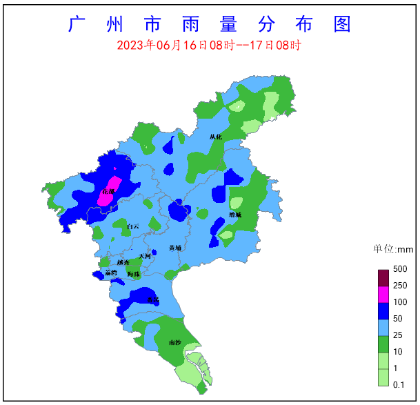 受南風加強影響,6月16-17日我市中部地區出現了暴雨,其中花都區有大暴雨,并伴有6-8級大風和雷電,雨勢較強時段為16日19-21時和17日04-07時。全市共有441個站點(93.6%)出現降雨,全市平均雨量36.3毫米,7個站點(1.5%)雨量在100~250毫米之間,76個站點(16.1%)雨量在50~100毫米之間,225個站點(47.8%)雨量在25~50毫米之間。各區平均雨量(單位:毫米):花都區67,番禺區43.3,天河區42.6,黃埔區40.9,越秀區40.6,海珠區38.6,白云區37.6,荔灣區36.4,增城區33.7,從化區26.3,南沙區17.4,其中花都區新華街錄得全市最大累積雨量121.5毫米。期間, 全市共有31個站點(6.6%)錄得6級以上陣風,1個站點(0.2%)錄得8~10級陣風,30個站點(6.4%)錄得6~8級陣風,花都區獅嶺鎮錄得全市最大陣風17.4米/秒(8級)。