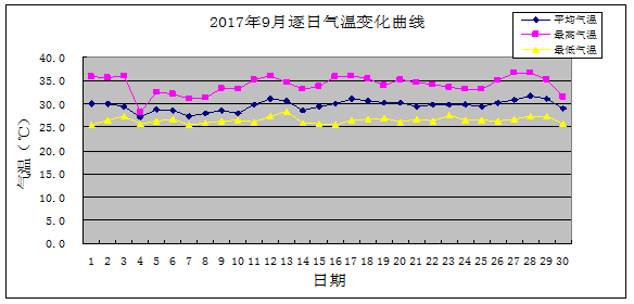本月平均氣溫29.7℃,與累年平均值比偏高2.1℃。其中,上、中、下旬平均氣溫與累年平均值比分別偏高0.3℃、2.4℃、3.5℃,極端最高氣溫36.7℃,出現在27日,極端最低氣溫25.4℃,出現在1日。