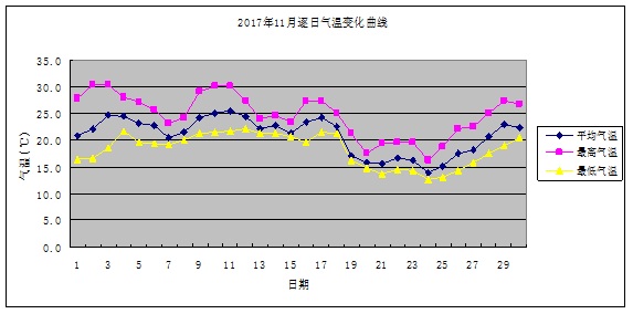 本月平均氣溫20.9℃,與累年平均值比偏高0.6℃。其中,上旬、中旬平均氣溫與累年平均值比分別偏高1.0℃、1.9℃,下旬平均氣溫與累年平均值比偏低0.9℃,極端最高氣溫30.4℃,出現在2日,極端最低氣溫12.6℃,出現在24日。