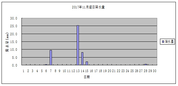 月總降雨量46.2毫米,與累年平均值比偏多2成。其中,上旬、下旬降雨量與累年平均值比分別偏少近4成、9成多,中旬降雨量是累年平均值的3倍,日最大降雨量25.4毫米,出現在13日。
