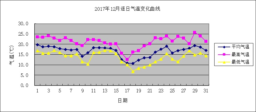 本月平均氣溫16.6℃,與累年平均值比偏高0.7℃。其中,上旬、下旬平均氣溫與累年平均值比分別偏高0.7℃、2.2℃,中旬平均氣溫與累年平均值比偏低0.8℃,極端最高氣溫25.7℃,出現在29日,極端最低氣溫6.8℃,出現在18日。